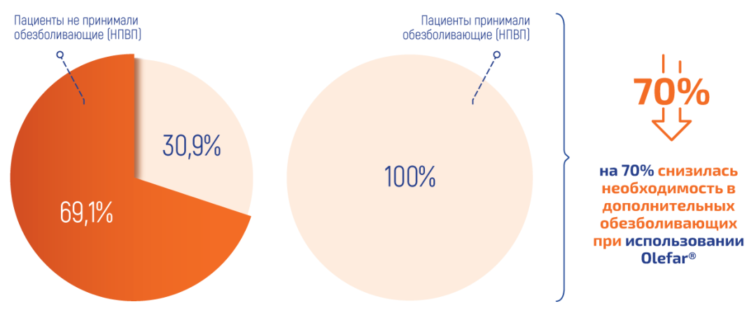 Исследование показывает, что у пациентов в группе с препаратом OLEFAR® DUO OIL SPRAY на основе комбинированных эфирных масел частота приема НПВП меньше, чем у пациентов в группе с плацебо, что доказывает эффективность OLEFAR® DUO OIL SPRAY.